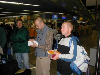 Michael verteilt die Tickets, Bernhard "hüthet" die Pässe, Thomas sieht etwas skeptisch drein...
